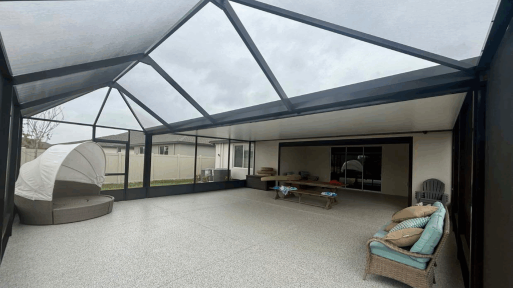 Client Location: Bartow, FloridaProject Type: Hybrid Screen Room & Concrete PatioTimeline: 90 DaysProject Cost: $32,500Status: CompleteHighlight Feature: Combo of solid roof and screen roof for flexible outdoor living A family in Bartow wanted a functional, spacious outdoor area where they could relax in the shade or soak up the sun—without compromising comfort or style. Graco…