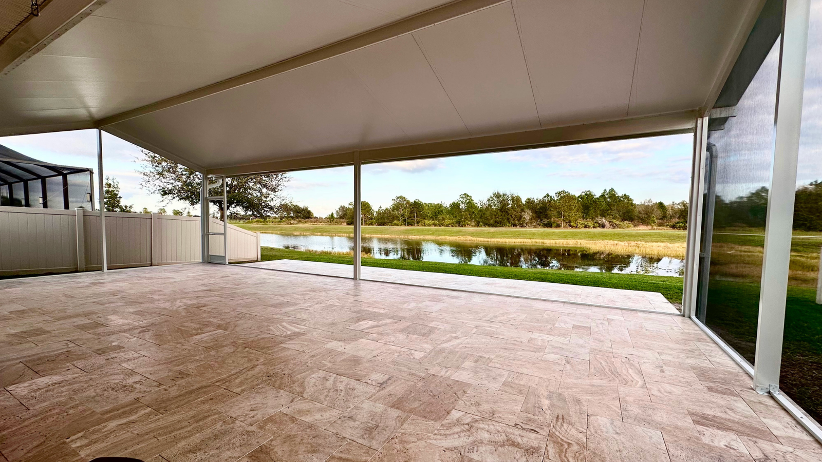What started as a small 6 x 22 lanai was transformed into a spacious 18 x 40 screened-in room featuring a solid roof, crisp white framing, and beautiful travertine flooring. A 10 x 40 drop-down patio extension added even more room for outdoor entertaining and everyday enjoyment.
